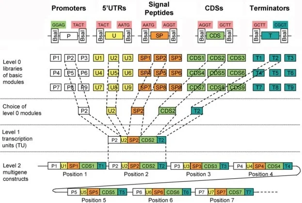 Golden gate cloning allows the rapid and flexible assembly of DNA constructs, using a combinatorial approach from an array of genetic elements (Fig 2). This technology is based on the special ability of type IIS restriction enzymes to cleave outside of their recognition site, the cleaved products contain compatible sequence overhangs allowing DNA fragments to be easily ligated. This cloning strategy develops three levels of modular libraries. The level 0 modules consist of promoters, 5’ untranslated regions, signal peptides, coding sequences and terminators with each module flanked by specific fusion sites to allow formation of complete transcriptional units. The resultant level 1 modules can then be assembled into the destination vector, creating the final construct for transformation (Weber et al., 2011).